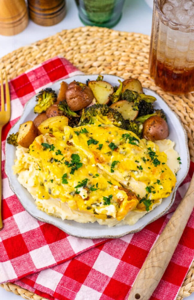 - 4 boneless skinless chicken breasts – The main protein, tender and juicy when baked under the creamy topping.