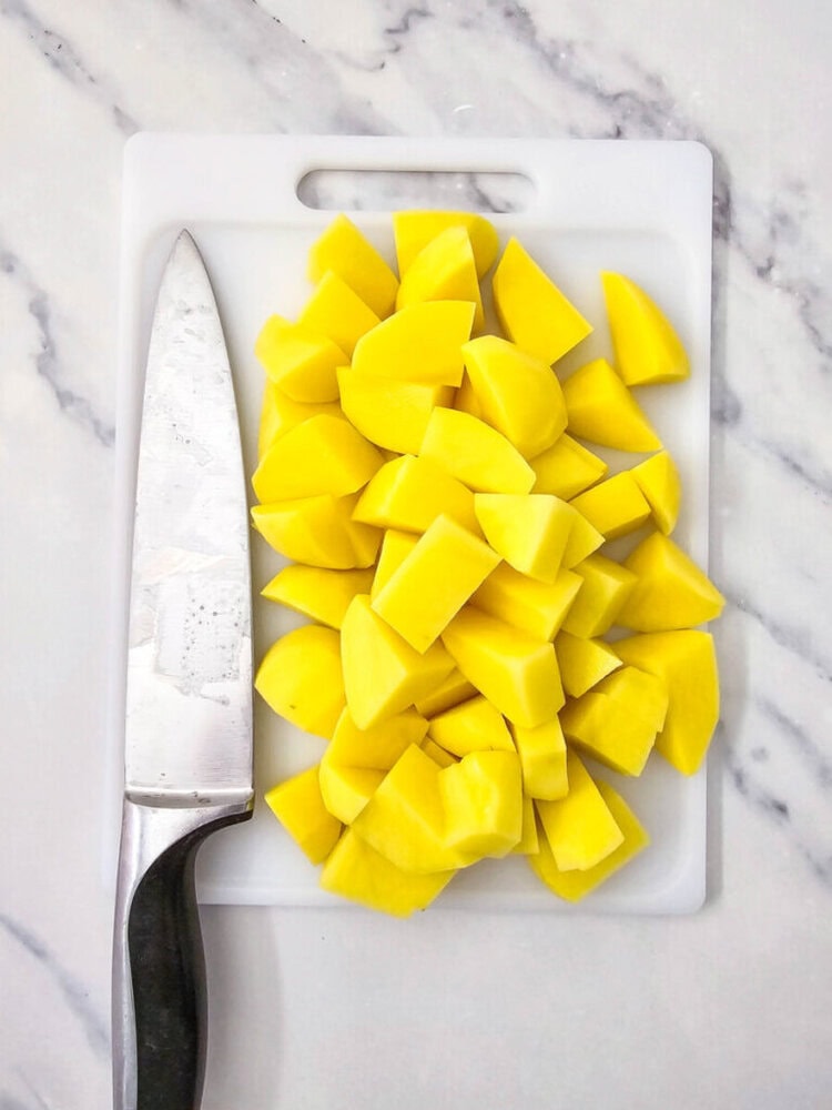 Peel the Yukon Gold potatoes, rinse them thoroughly, and cut them into small, evenly sized pieces.