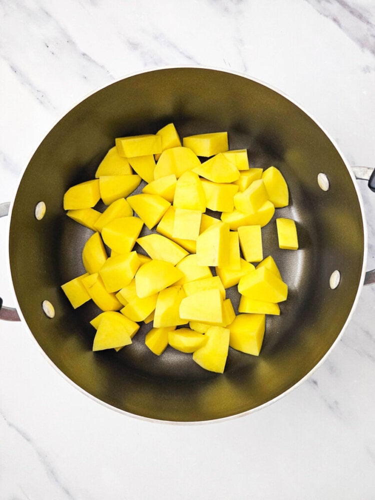 Place the cut potatoes into a medium or large pot and cover them with water. Bring the water to a boil, then reduce the heat to a gentle simmer.