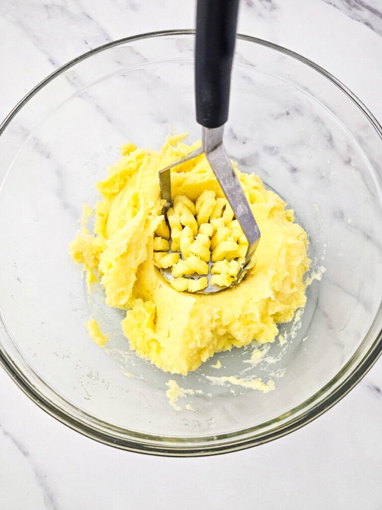 Using a potato masher, mash everything together until the potatoes are smooth and creamy.