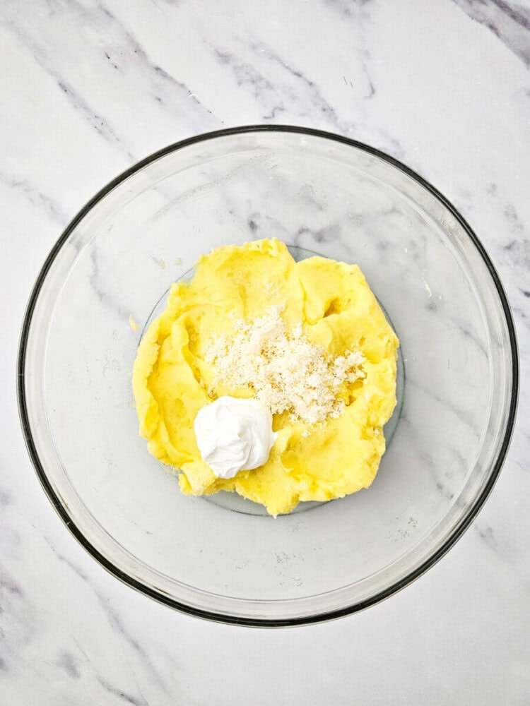 - Step 5: Stir in Parmesan and Sour Cream – Gently stir in the freshly grated parmesan and sour cream until fully incorporated. Taste and adjust as needed for your desired flavor and texture.