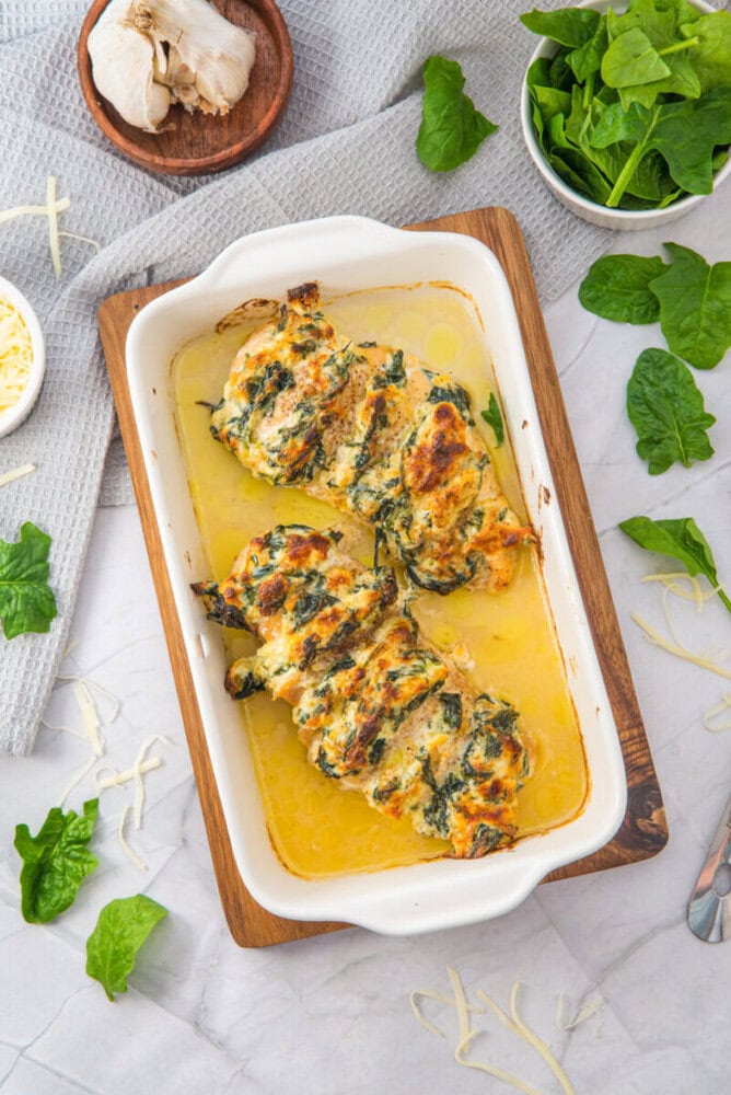 That is what this recipe does. It turns simple ingredients into something that looks thoughtful without being fussy. The slits in the chicken hold onto that creamy spinach filling like little pockets of comfort. The cheese melts just enough. The garlic does what garlic always does and makes the kitchen smell like you are doing something right.