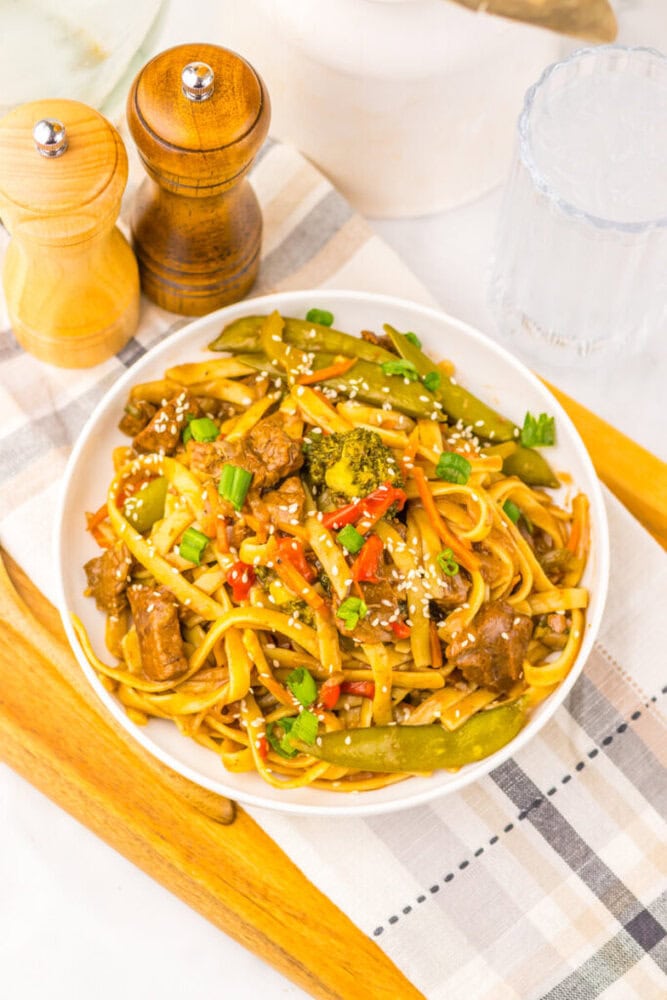 Slow Cooker Beef Lo Mein is a cozy, takeout style noodle dish made right in your slow cooker with tender slices of beef, a savory and slightly sweet soy sauce based broth, colorful vegetables, and soft noodles tossed in at the end for the perfect finish.