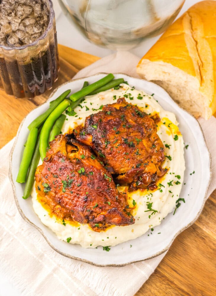 By the time dinner rolls around you have juicy chicken thighs coated in a glossy mustard barbecue sauce that tastes like it came from a roadside barbecue joint somewhere in the Carolinas.