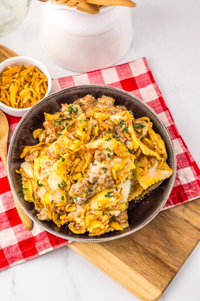 I usually start this one in the afternoon when the house is still buzzing. Kids doing homework, someone asking what is for dinner every ten minutes, and me pretending I do not hear it. By the time evening rolls around, the slow cooker has done the hard work. The beef is seasoned and tender, the onions have melted into the sauce, and all that is left is stirring in the ravioli and letting the cheese melt into a golden blanket on top.