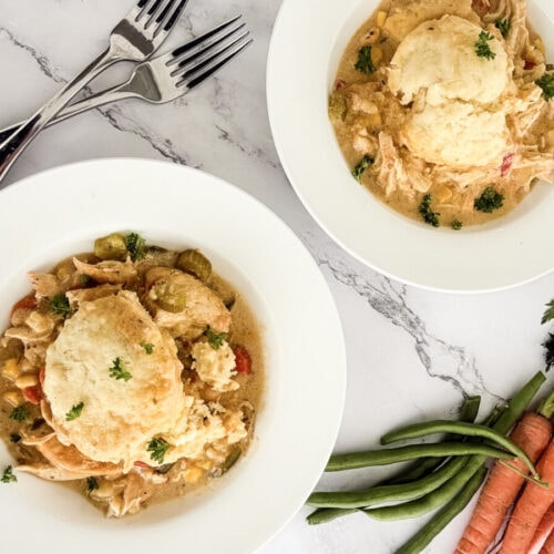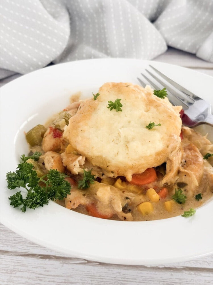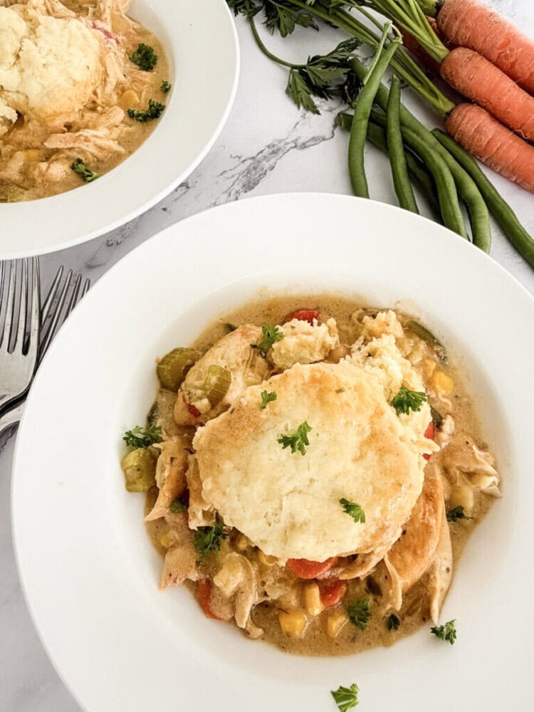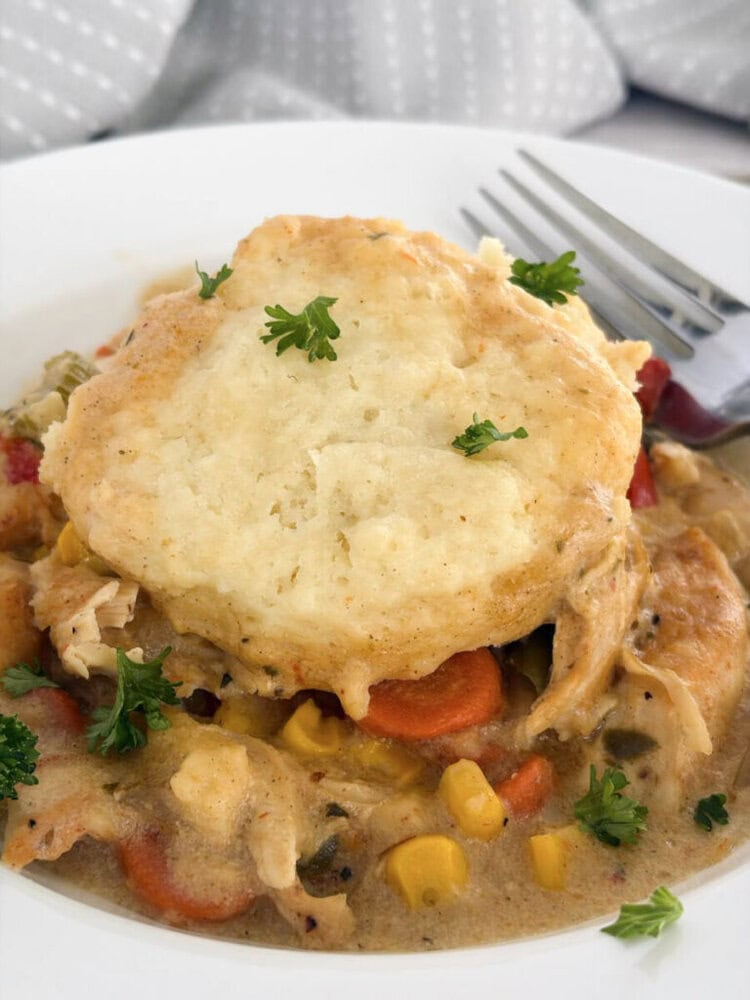 This recipe is a hearty slow cooker version of a classic chicken pot pie. Instead of baking everything in a crust, we build a rich creamy filling with seasoned chicken and vegetables, then finish it with soft, fluffy biscuits right on top.