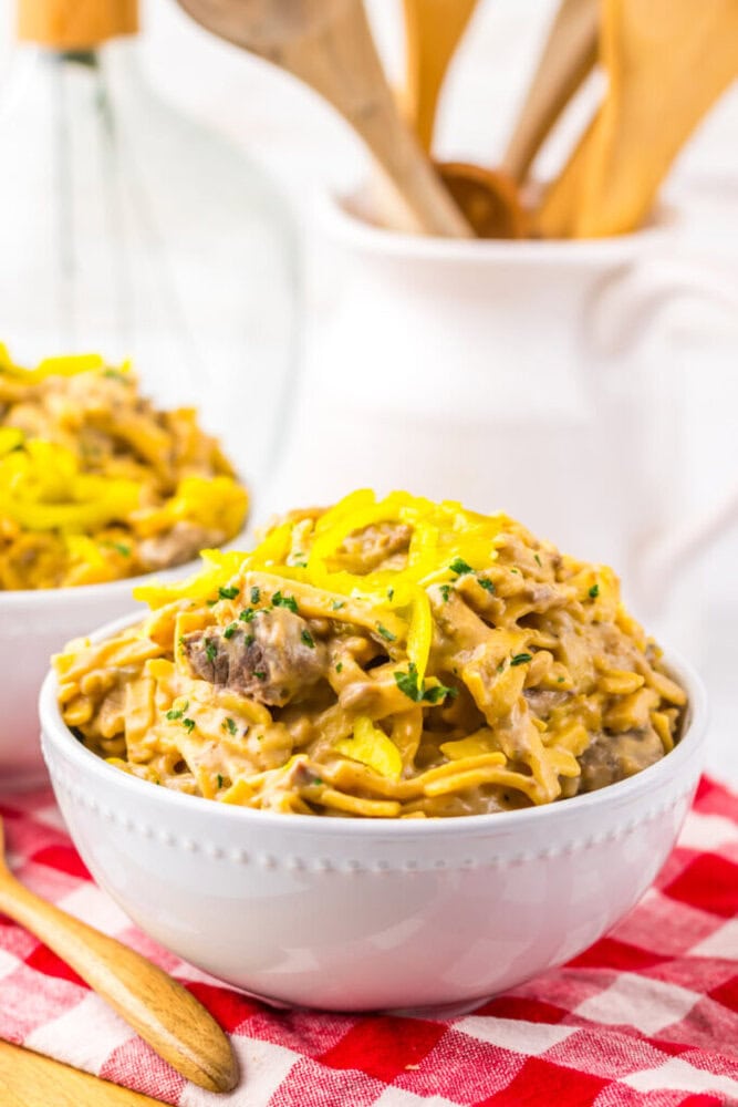 Slow Cooker Mississippi Beef and Noodles is a hearty comfort food dish made by cooking stew beef low and slow with ranch seasoning, brown gravy mix, beef broth, and pepperoncini peppers until tender, then adding egg noodles and cream to turn it into a rich and savory one pot meal.