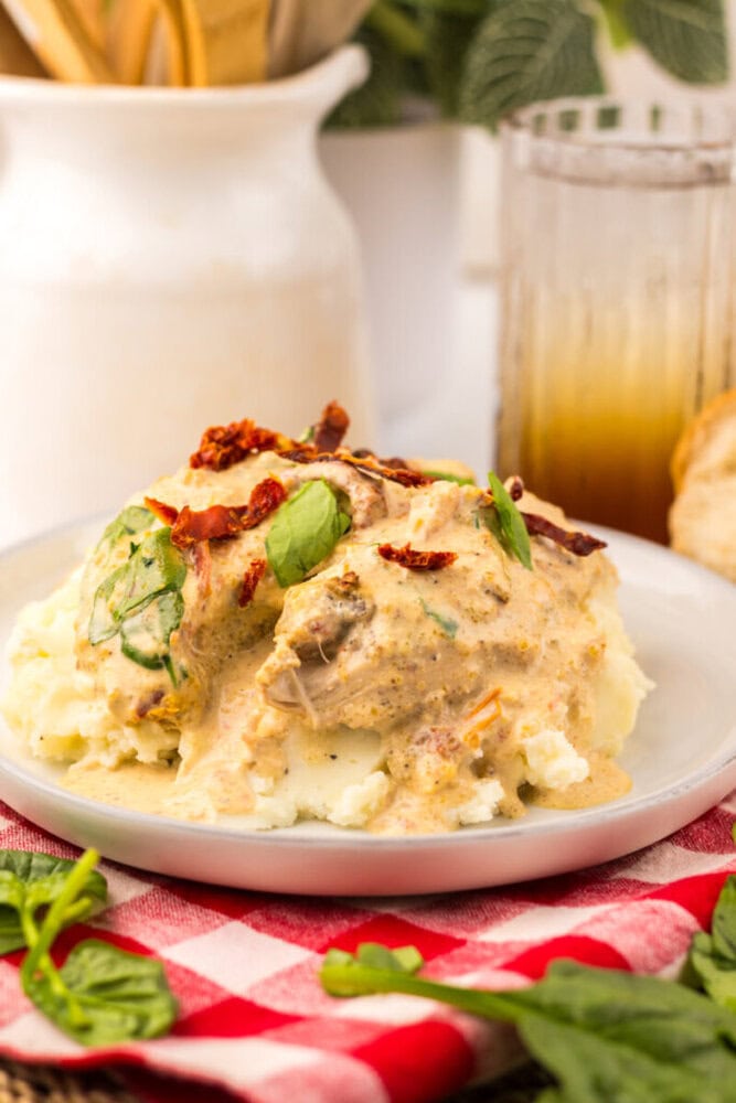 This is the meal I make on those busy afternoons when homework is scattered across the table, someone is asking what is for dinner for the third time, and I just want everyone to slow down and sit together for a minute. The sauce is creamy and rich, the chicken is fall apart tender, and those little pops of sun dried tomatoes make it feel like something you would order at a cozy Italian restaurant instead of something you made in sweatpants.